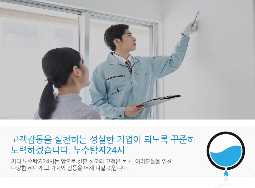 저희 누수탐지24시는 앞으로 한분 한분의 고객은 물론, 여러분들을 위한 다양한 혜택과 그 가치와 감동을 더해 나갈 것입니다.